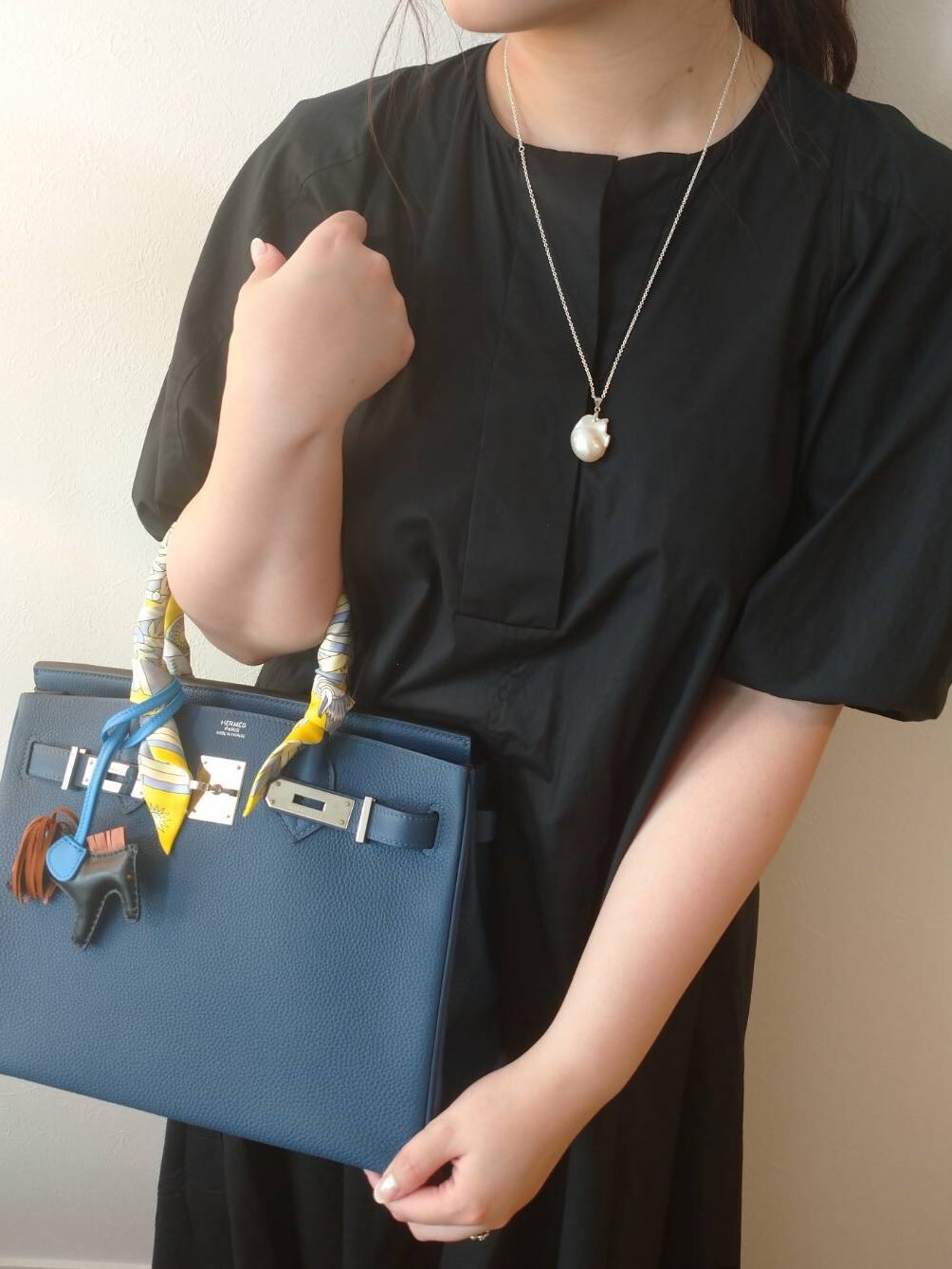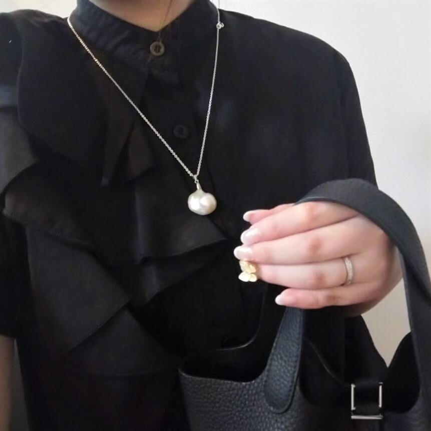 ブラックのリネンワンピに。ワンピースが甘めなアイテムの為、個性的なバロックパールを合わせてモードに合わせました。大粒のパールなので、シンプルなワンピースに合わせるだけでも華やかに見えます。
